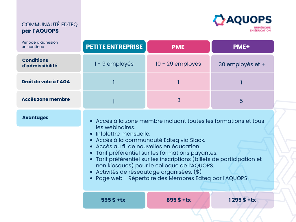 Vous souhaitez développer votre présence dans le milieu de l’éducation et toucher un réseau de plus de 1 200 professionnels passionnés par le numérique? La communauté Edteq par l'AQUOPS vous offre un programme de partenariat conçu pour répondre à vos besoins et vous aider à atteindre vos objectifs.